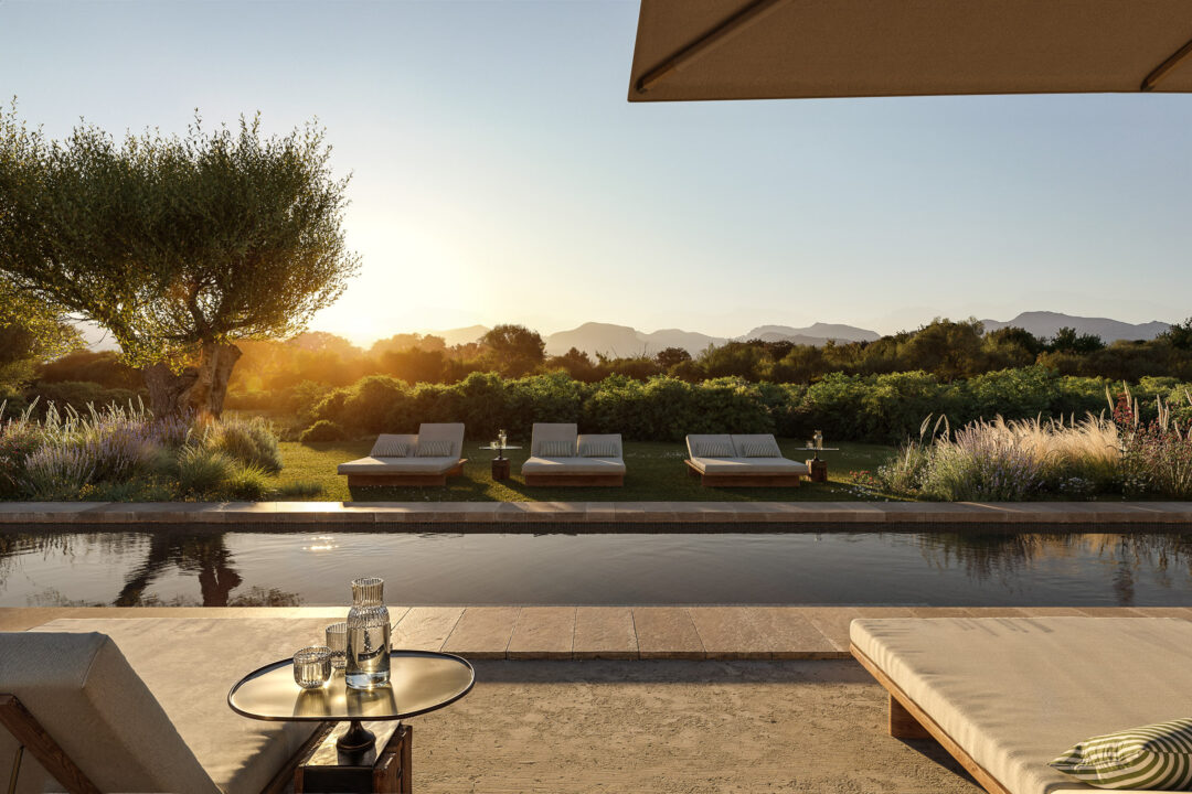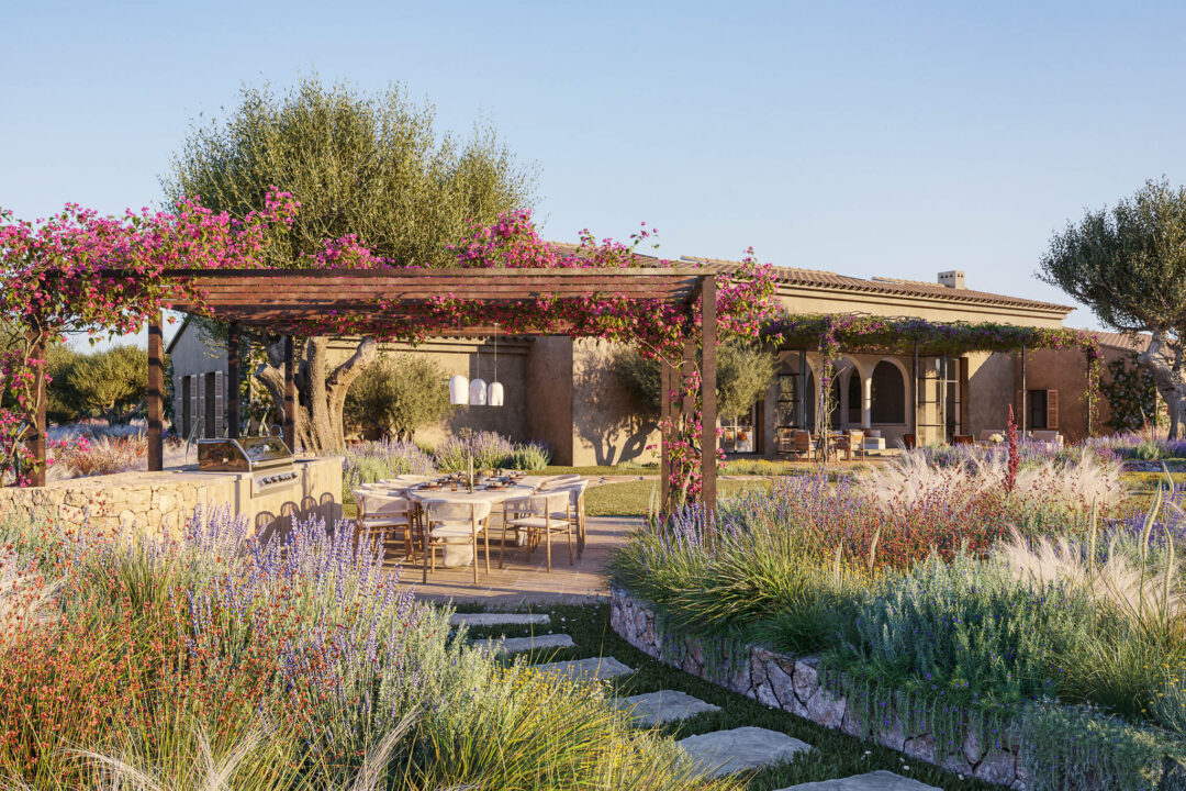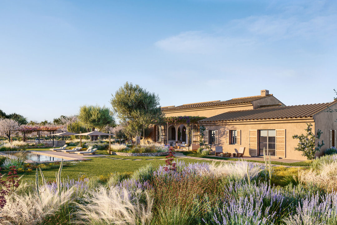 The outdoor areas are carefully landscaped with Mediterranean plants and natural stone features. A standout element is the dark green swimming pool, finished with Onix Penta Bali tiles, creating a calm and elegant setting to enjoy the Mallorcan climate.