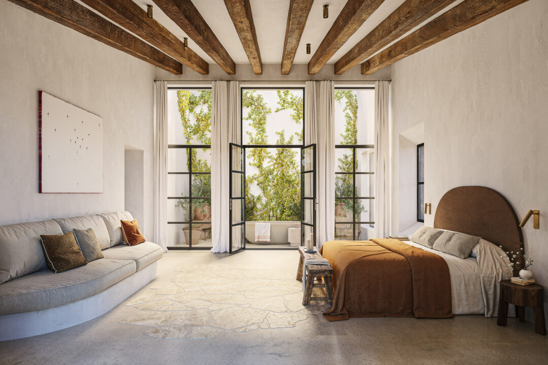 Natural materials and craftsmanship play a key role throughout the interior. Walls are finished with smooth lime plaster, while bathrooms feature traditional finishes. Ceilings with chestnut wood beams add warmth and character.