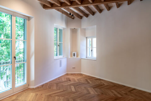 Designed to the highest modern standards, the apartment includes underfloor heating, central air conditioning, Aerothermal energy, a full Sonos sound system, and triple-glazed windows. Architectural details such as exposed wooden beams and a Marés stone accent wall provide a subtle nod to the area’s heritage. Residents also enjoy access to a shared rooftop terrace with views of the leafy boulevard below. The property comes with a private storage room, and a rented parking space nearby is available for transfer. With an elevator license already in place and construction planned, this exclusive residence offers a rare blend of Old Town charm and modern luxury.