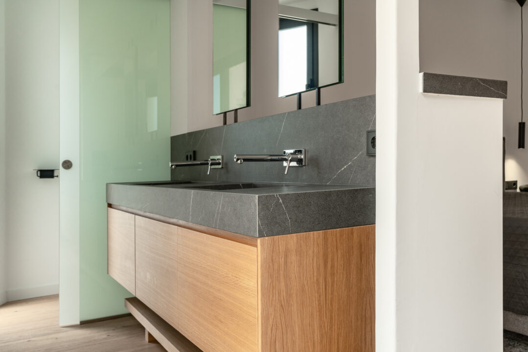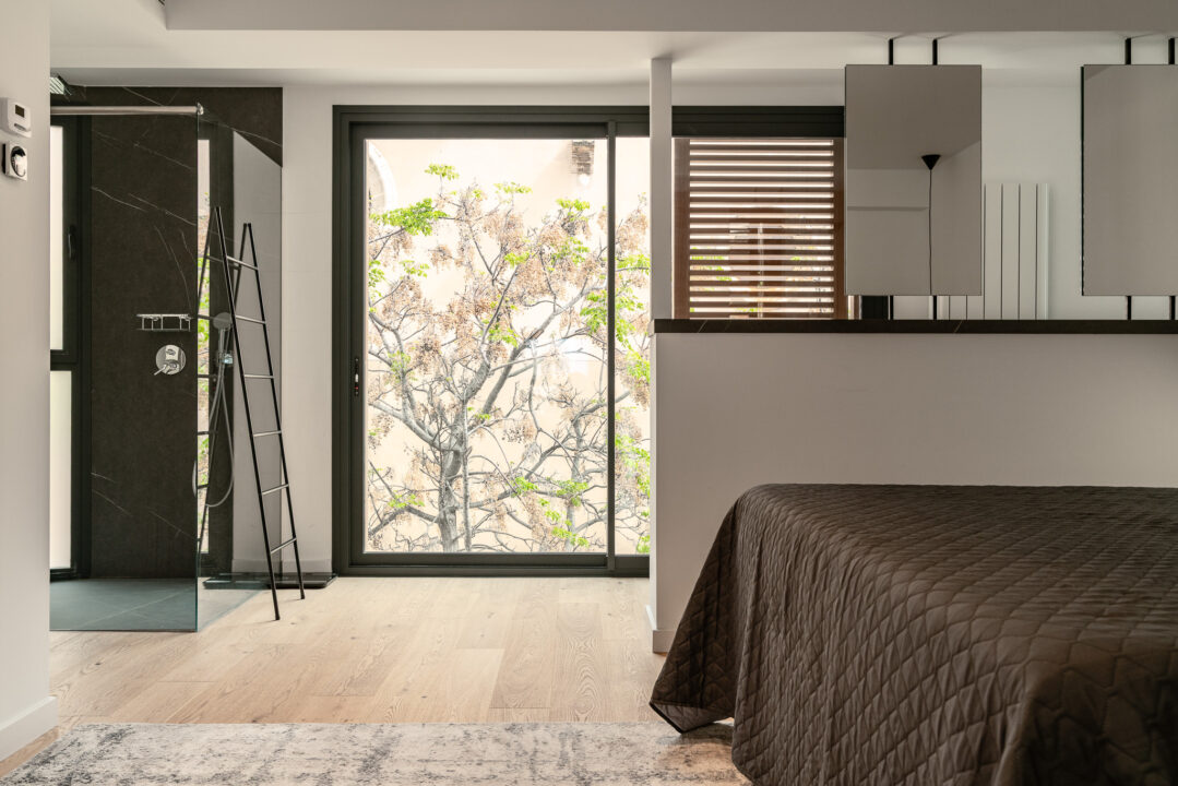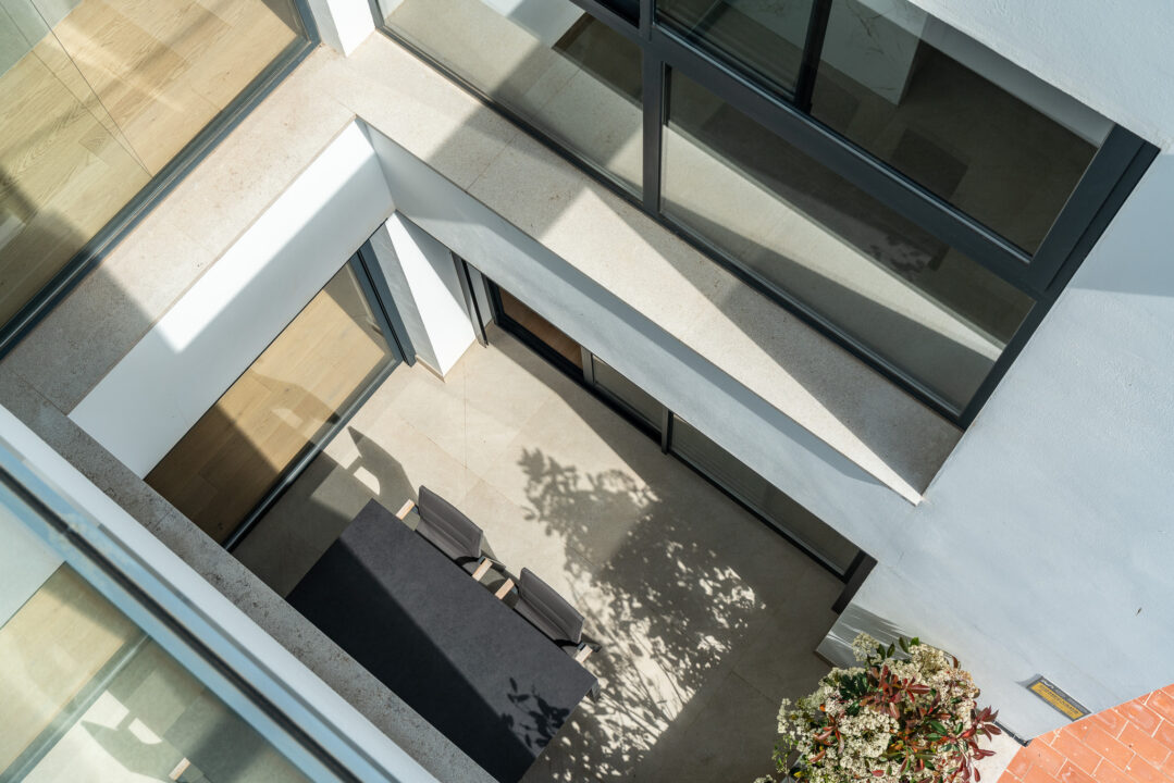 The property is distributed over two levels and designed to maximise light, space, and connection to its surroundings. The living areas are open and bright, with large windows and direct access to outdoor spaces. In total, the home offers three bedrooms and three bathrooms plus a guest toilet, combining comfort with a practical layout.