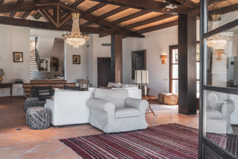 The villa’s design embraces natural light and indoor-outdoor living through expansive windows and multiple terraces. The layout includes six bedrooms and five bathrooms, ideal for large families or entertaining guests. Three of the bedrooms are in the main building and have en-suite bathrooms. The remaining two are in a guest annex where you have a shared bathroom. The open plan living and dining areas, combined with a fully equipped kitchen, create a welcoming atmosphere. Finishes like exposed natural-toned wood beams and a stone façade infuse the home with warm Mediterranean charm. Comfort is ensured year-round with air conditioning and electric underfloor heating throughout.