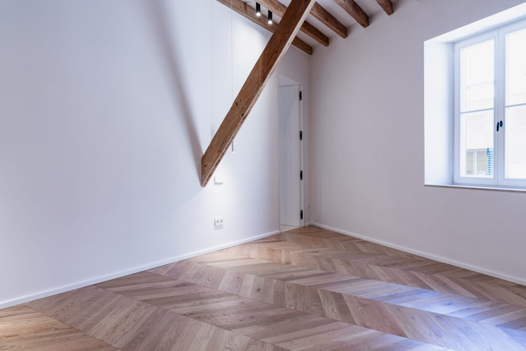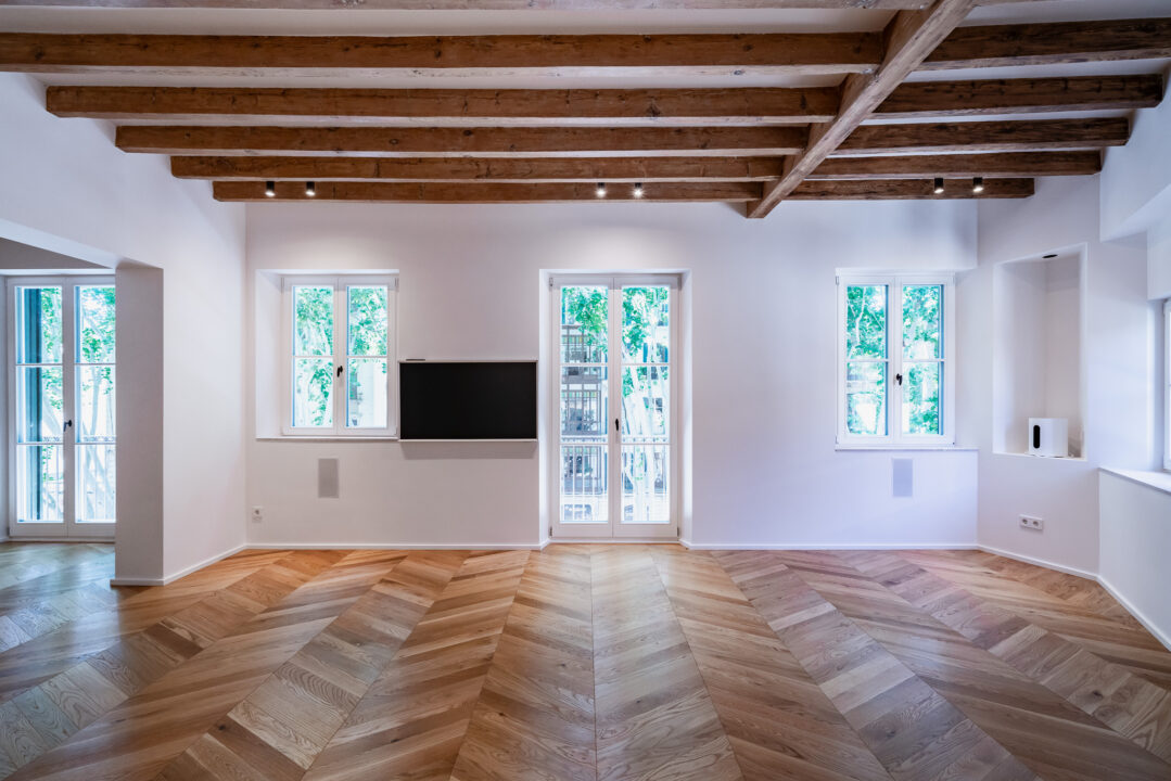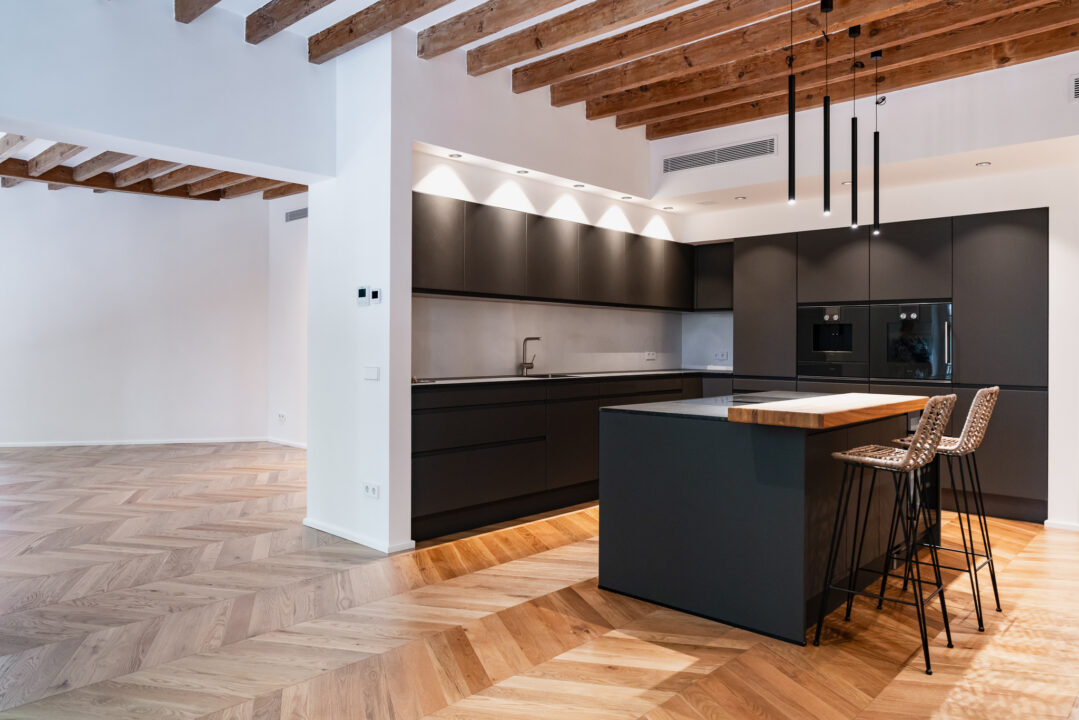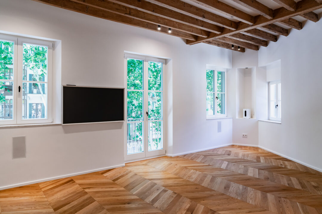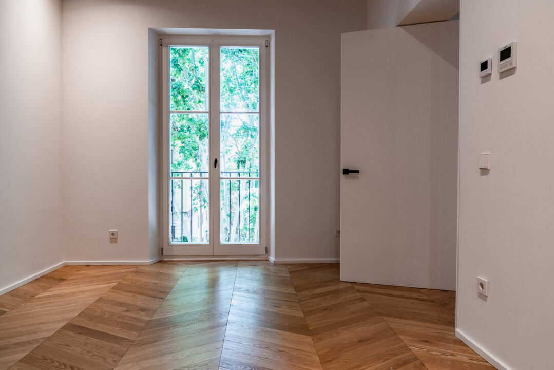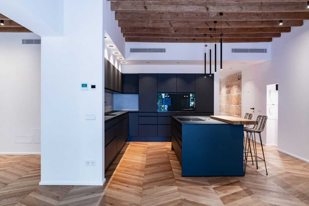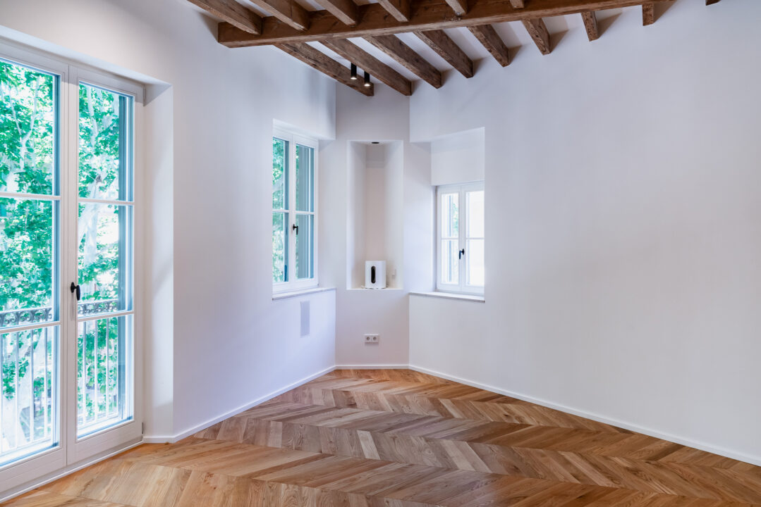 Modern systems have been carefully integrated to ensure year-round comfort, including underfloor heating, central air conditioning, Aerothermal energy, triple-glazed windows, and a full Sonos sound system. Original features such as exposed wooden beams and a Marés stone accent wall add warmth and character, reflecting the building’s Old Town setting. Residents also have access to a shared rooftop terrace, offering open views over the leafy boulevard.