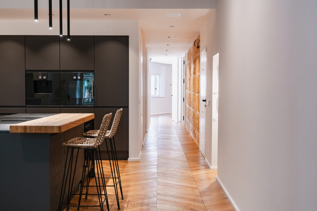 The apartment is designed for relaxed, modern living, with a spacious open-plan living, dining, and kitchen area filled with natural light. Floor-to-ceiling windows open onto a balcony overlooking La Rambla, creating a pleasant connection to the street below. The custom-made kitchen features high-quality Gaggenau and Miele appliances, including a wine fridge, making it ideal for both everyday use and entertaining.