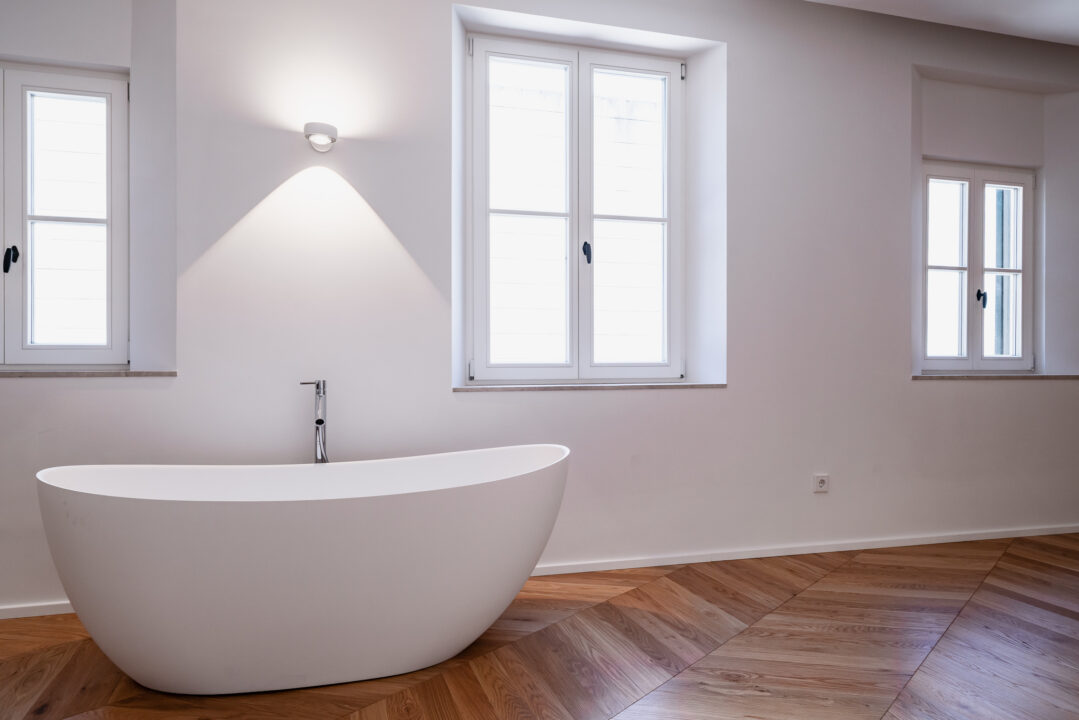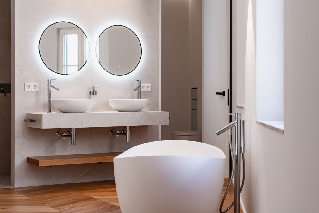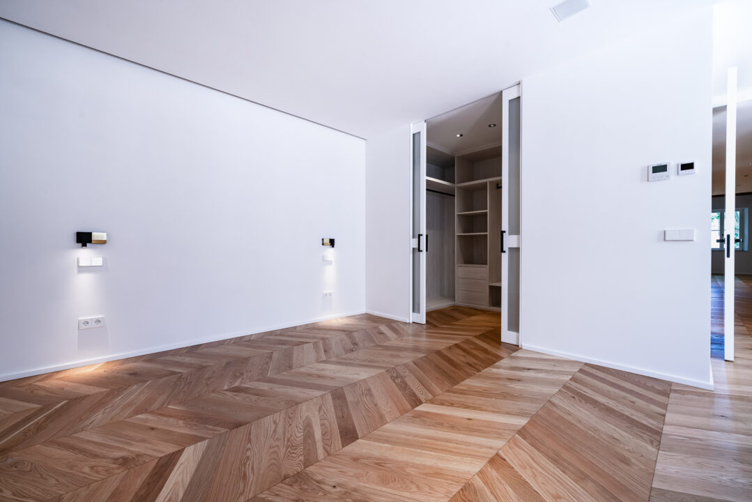 There are three comfortable bedrooms and three bathrooms, two of them en suite, offering privacy for family and guests. The main bedroom is designed as a calm retreat, with a walk-in wardrobe, freestanding bathtub, and separate rain shower—bringing a hotel-style feel into the home. Throughout the apartment, built-in wardrobes, oak herringbone parquet floors, and natural stone finishes create a cohesive and understated design.